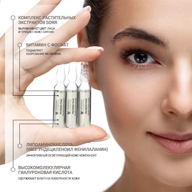 Применение: Наносите на чистую кожу утром и вечером. Оберните кончик ампулы бумажной салфеткой и отломите резким движением. Вылейте содержимое на ладонь и распределите по коже, дайте впитаться. Затем нанесите крем по типу кожи. Только для наружного применения. *Для эффективного осветления кожи, сочетайте применение ампул Melafadin Fluid с продуктами из линии FAIR SKIN и применяйте солнцезащитные средства с высоким SPF (не менее 30).